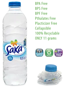 BPA-Free, BPS-free, BPF-free, Placticizer-free, Pthalates-free, 100% Recyclable and Collapsible Bottle – Easy to Carry, Crush and Recycle. Saka Bottles are also one of the lightest bottles on the market saving resources.